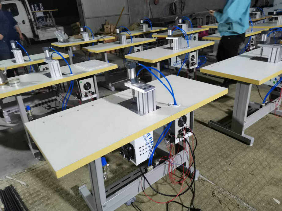 本機(jī)以超聲波將綁帶融合于口罩本體兩側(cè),進(jìn)而完成綁帶式口罩成品,只需一名操作員將口罩片置于超聲波發(fā)生器的頭上,后將綁帶放在口罩片上,腳踏踏板使氣缸向下運動,縫住綁帶和口罩片。
